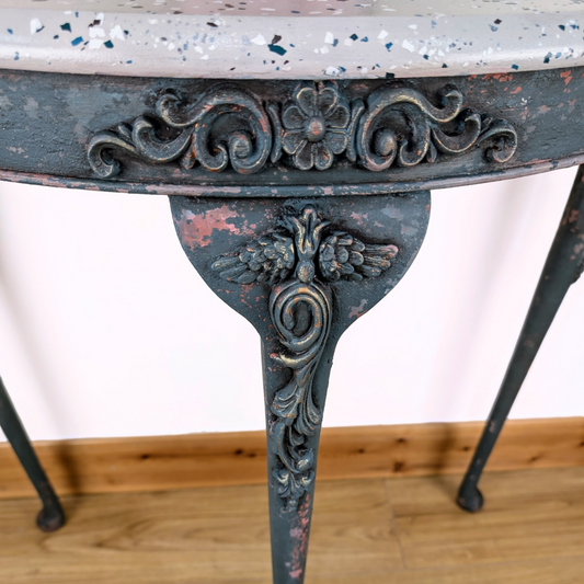 Rustic vintage hallway table, demi lune, half moon, chippy paint layers of green, peach and white, wooden mouldings & faux terrazzo top