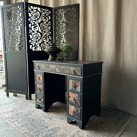 Small Vintage Desk Painted Black & Decoupaged Oriental Theme Twin Pedestal Desk