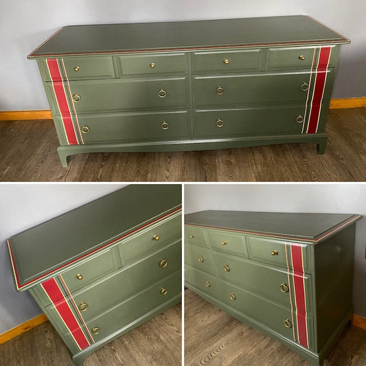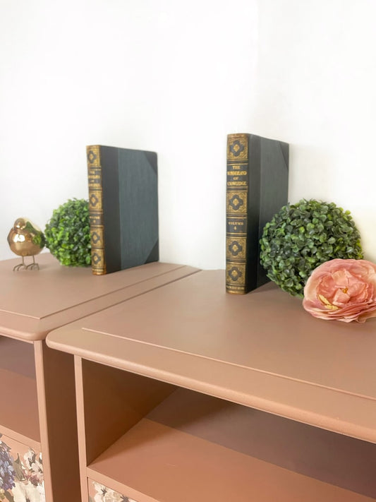 MADE TO ORDER Pretty Refurbished Stag Minstrel 4 drawer bedside tables, navy blue with gold foil design, bird song, nightstands, vintage, blossom art deco