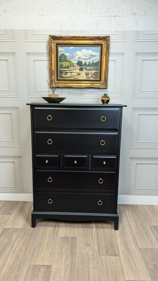 Black stag minstrel, tallboy,chest of drawers, black,bedroom furniture, black chest of drawers