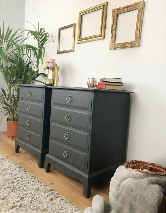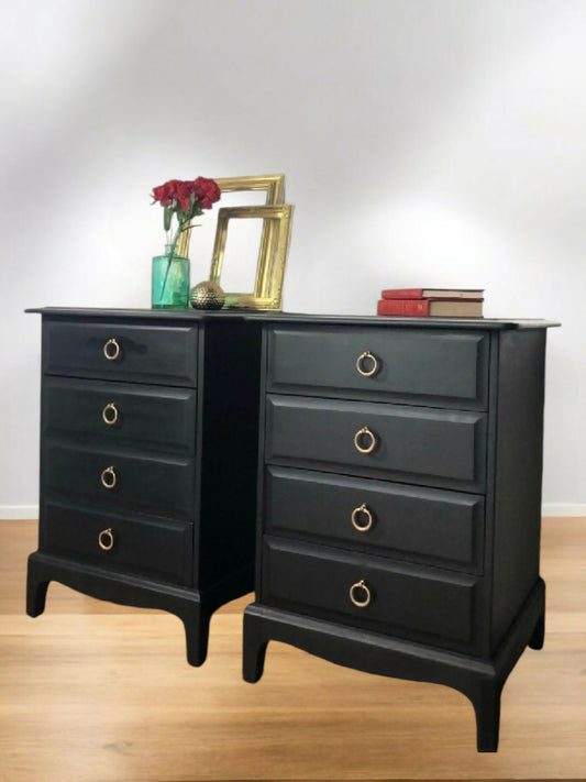 Made To Order Refinished Vintage Stag Minstrel bedside tables in black, gold, nightstands, mid century, bedroom drawers