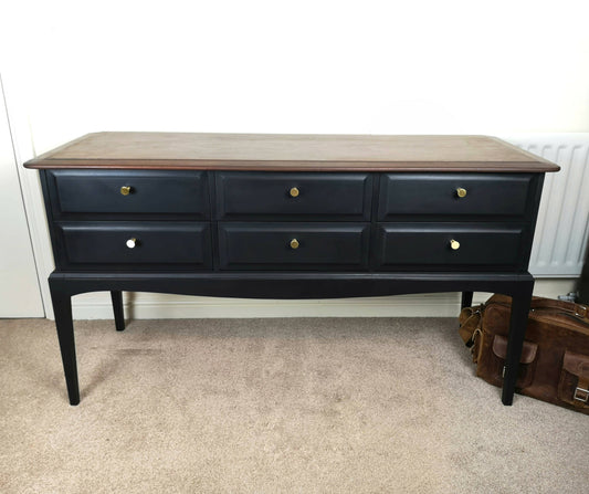 Stag Minstrel 6 drawer console table. Black with stripped & restored top with dark stain.