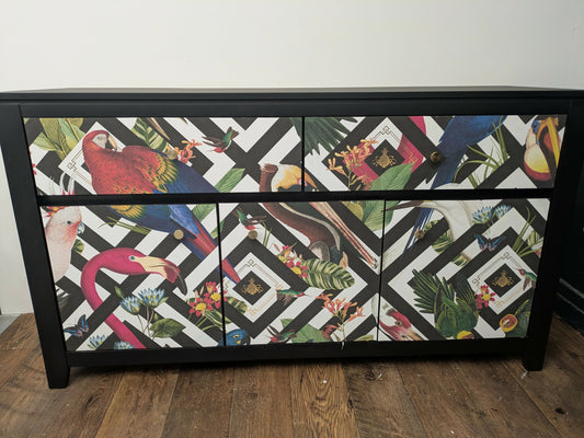 Mid century Retro Meredew Sideboard: Upcycled Charcoal Grey Floral Bird Print TV Unit. Commission Piece.