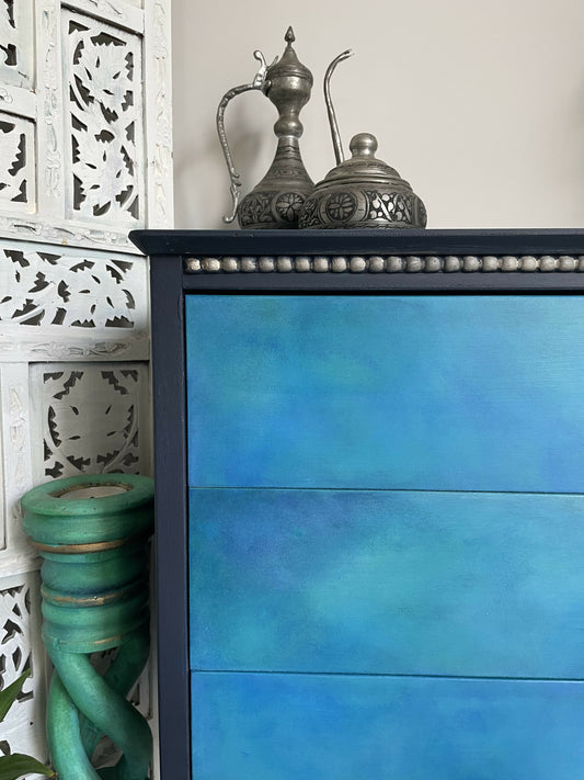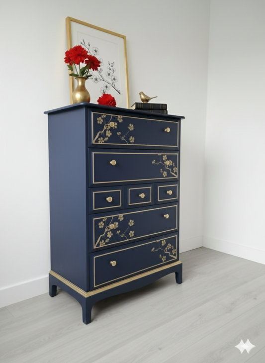 Vintage Stag minstrel 7 drawers tallboy, navy blue chest of drawers mid century modern dresser