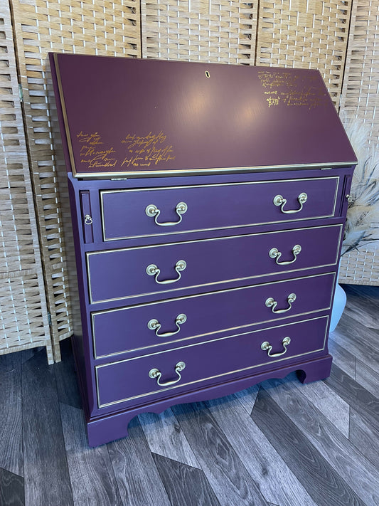Vintage art deco navy blue and gold dressing table, walnut burr wood desk