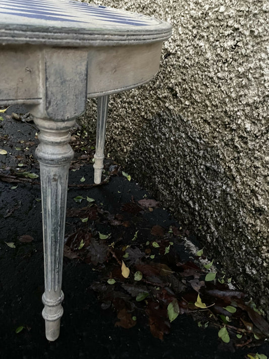 Vintage coffee table painted in a textured patina with french diamond stencil design.