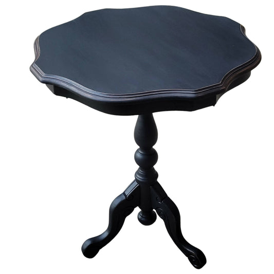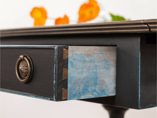 **Sold**Vintage Hand painted round side table, coffee table, Pedestal Drum Table, Round coffee table. Black table, Navy Gold Amber. Two drawers.