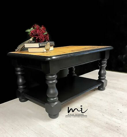 Black Farmhouse Pine Coffee Table with floral design, Sofa Table