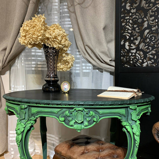 French Antique Occasional Table Oval Table Ornate Carvings Green and Black