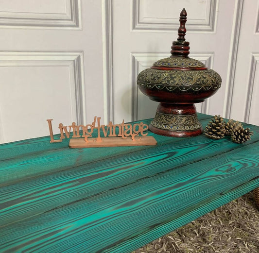 Solid Pine Coffee Table with Hairpin Legs Turquoise Charred Wood Yakisugi Technique