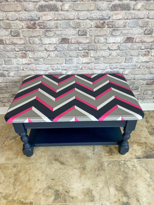 Stunning Geometric Pine Coffee Table – Hand Painted in Bold Midnight Blue & Pink Fusion Tones”