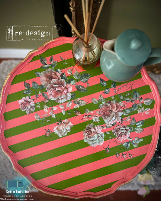 French Style Rose Embellishment Bedside Table – Eco-Friendly Steaming Green / Duck Egg Blue with Gold Wax Highlights and Floral Decoupage Top