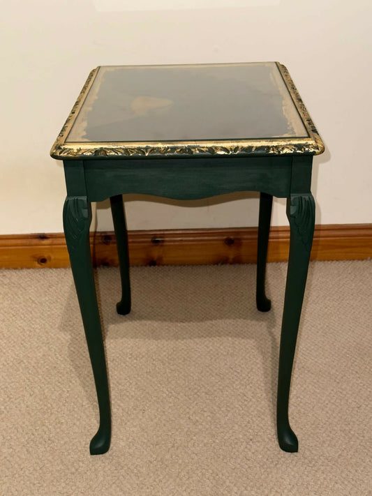 Hand Painted Decoupage Side Table with Glass Top – One of a Kind Green Parrot Design
