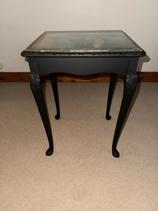 Hand Painted Decoupage Side Table with Glass Top – One of a Kind Black Cat Design