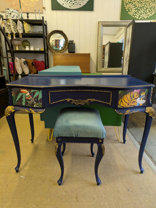 Vintage French Dressing Table, Desk Bedroom Office. Painted Furniture. Upcycled Navy Blue Gold Tropical Bird Commission Piece