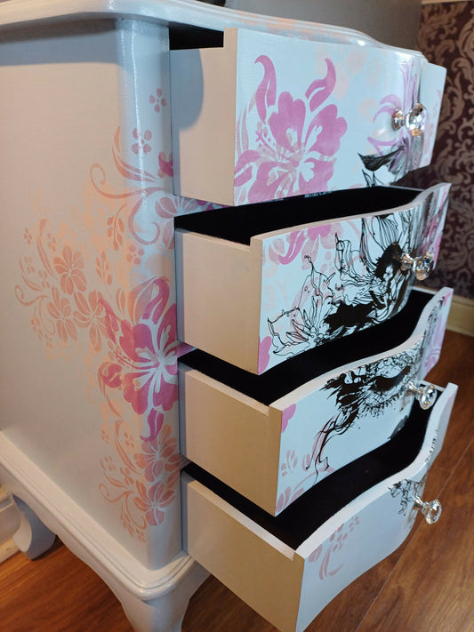 Upcycled Ladies Bedside Table with Drawers and Floral/ Beauty Design