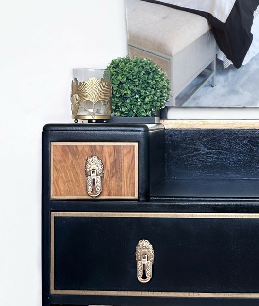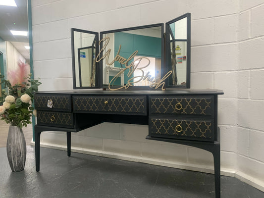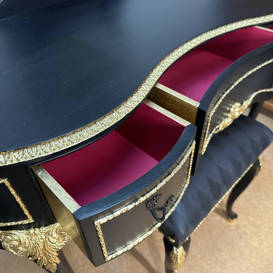 **This Item is Sold** Olympus dressing table and vintage stool. French Louis style in luxurious black with gold leaf and harlequin detail.