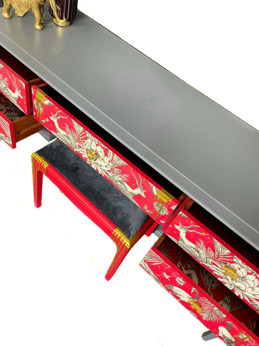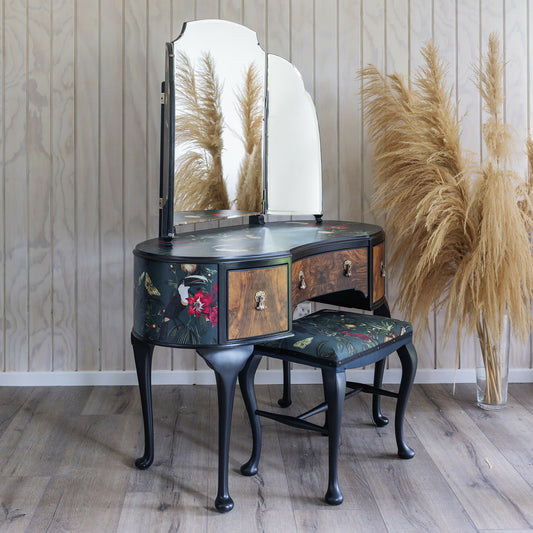Queen Anne dressing table decoupaged in a stunning Amazon tropical birds fabric. Sold, commission available.