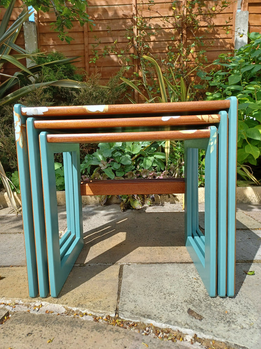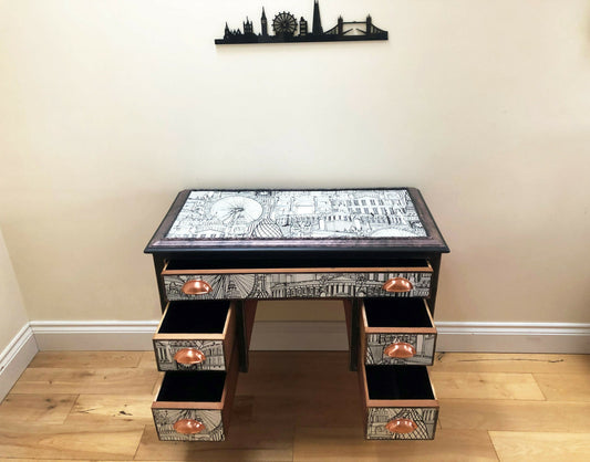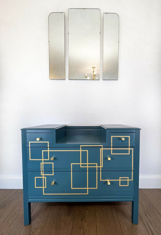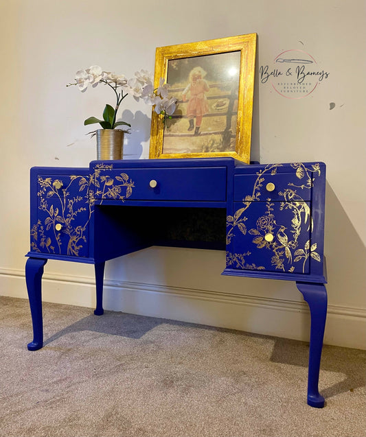 One of a kind blue vintage Queen Anne stye dressing table decoupaged in a stunning Verbena Kew Gardens fabric. Sold, commission available.