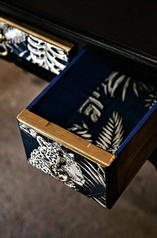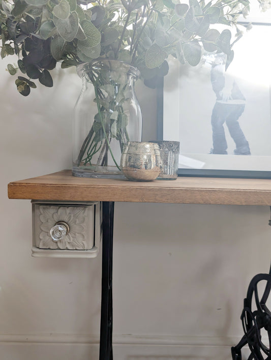 MADE TO ORDER: Yellow and pink console/hallway table/desk, with floral paper drawer lining
