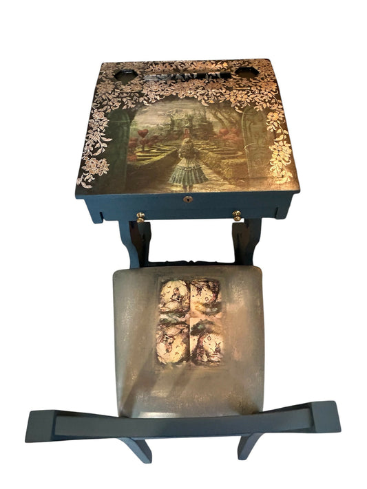 Vintage lift lid Alice in Wonderland themed school desk with chair