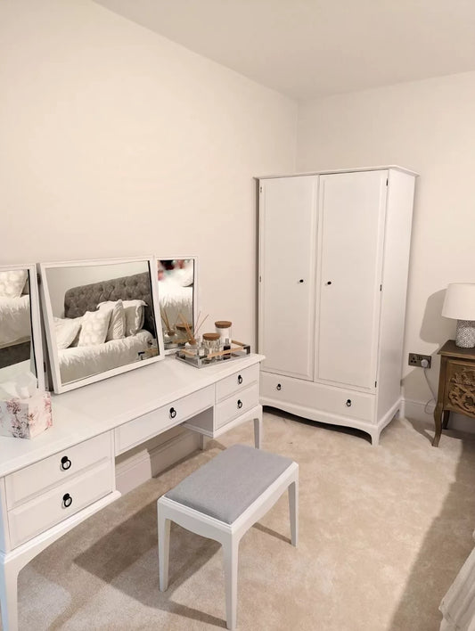 1940s Wrighton Dressing Table & Matching Bedside Cabinets | Vintage Painted Bedroom Set with Triple Mirrors and Glass Top