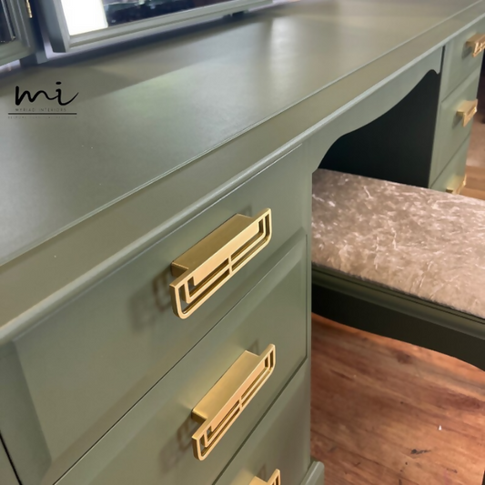 Made to Order - Refurbished vintage Stag Minstrel Dressing table set, mirror, stool, upcycled, olive green, mid century modern