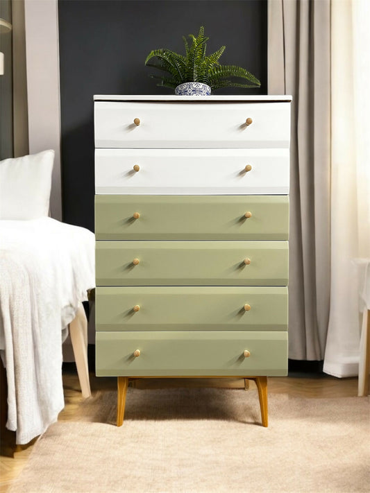 Mid Century Modern Meredew Painted Tall Chest of Drawers, in White and Soft Sage Green