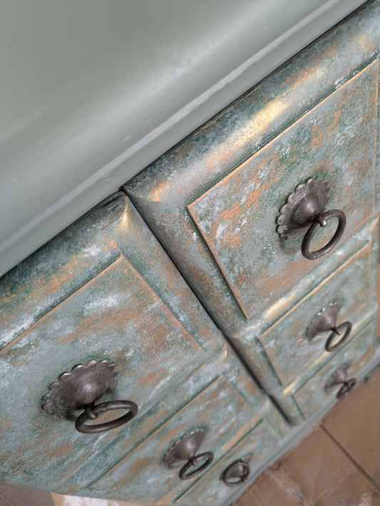 Pretty Refinished Chest of Drawers in eucalyptus green with decoupaged with a floral mural, botanical, dresser, sage green sideboard, draws