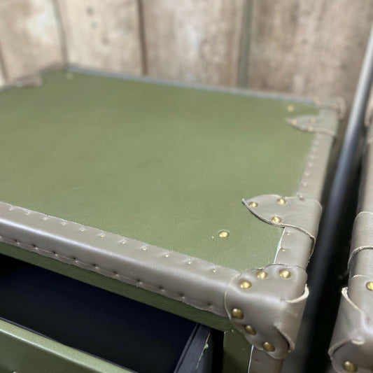 Luxurious olive green and taupe leather bedside console draw tables