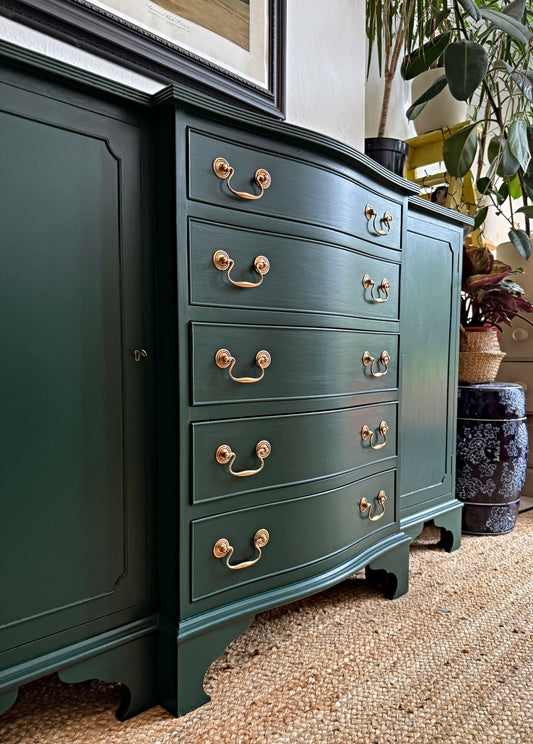 Newly refurbished break front/bow fronted sideboard green vintage dresser