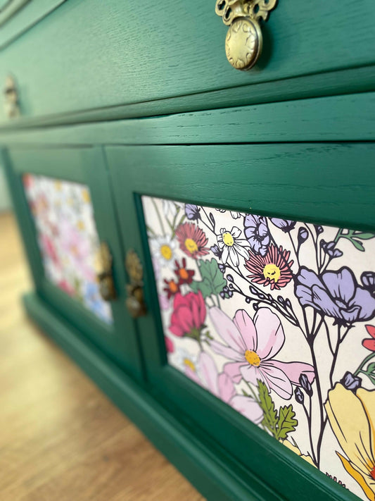 Refurbished Victoria Green Wildflower Floral Sideboard tv unit Oak Cabinet