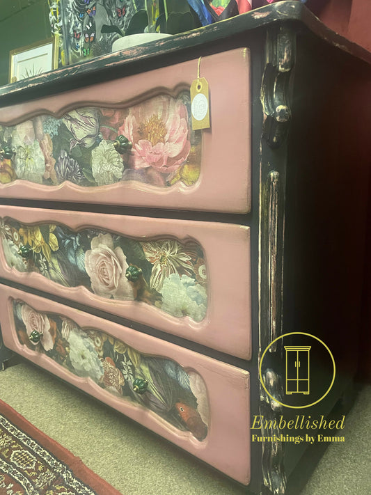 Chest of draws (Green/pink/floral). Distressed finish,shabby chic