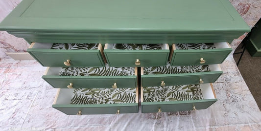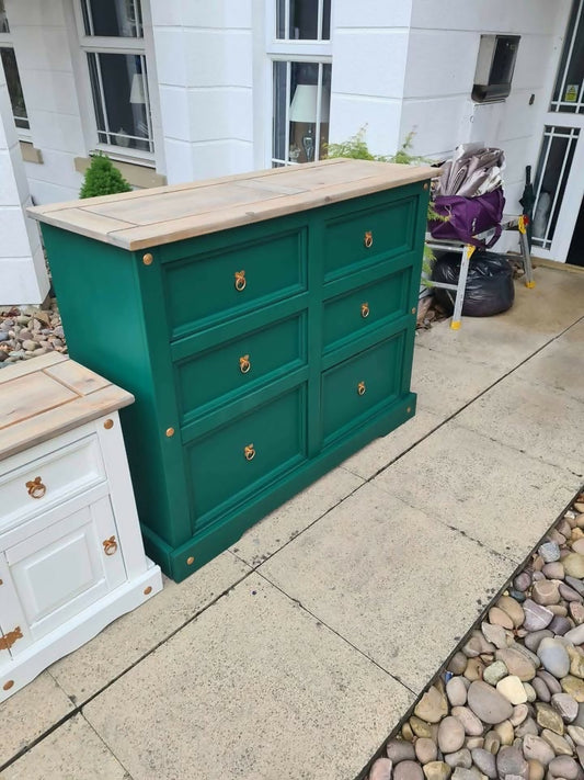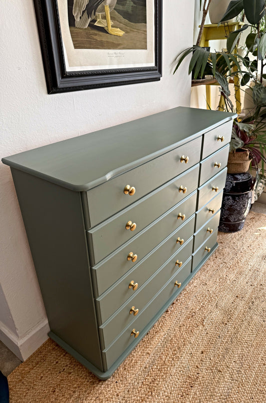 Newly refurbished large solid wood chest of drawers bank of drawers green