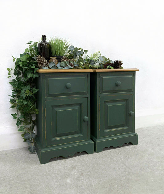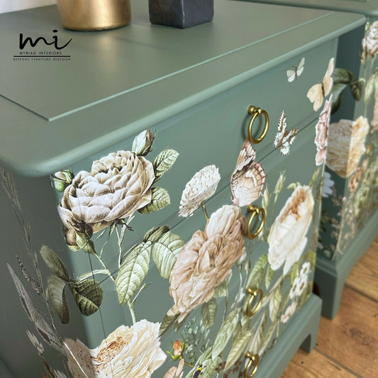 Made To Order - Refurbished vintage Stag Minstrel bedside tables, dusky olive green with floral design, sage green nightstands