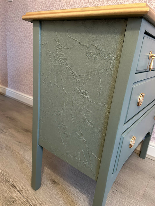 Refurbished Stag Minstrel chest of drawers, textured decoupage, dresser, draws, blue green mint, sideboard