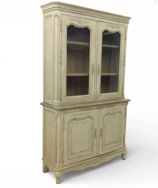 Vintage French Painted Pine display cabinet Glazed doors carving shelves cabrio