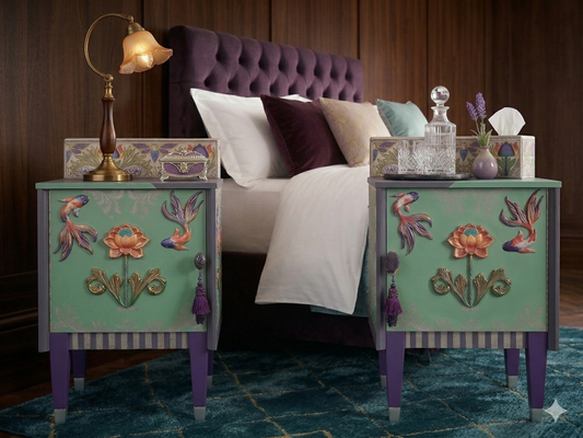 RARE Vintage Harris Lebus Hand-Painted "Koi & Chinoiserie" Bedside Pair Cabinets Side Tables
