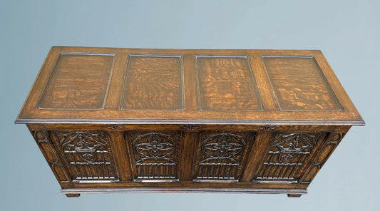 A Large Carved Oak Bedding or Blanket Box With Raised Linen Fold Panels
