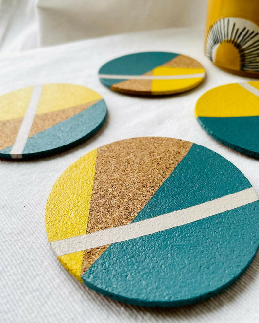 SOLD Set of 4 Cork Coasters - Hand Painted Geometric/Modern Design (Blue/Yellow/White)