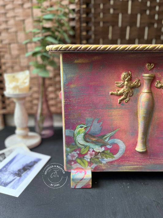 Queen Anne dressing table decoupaged in a stunning Amazon tropical birds fabric. Sold, commission available.