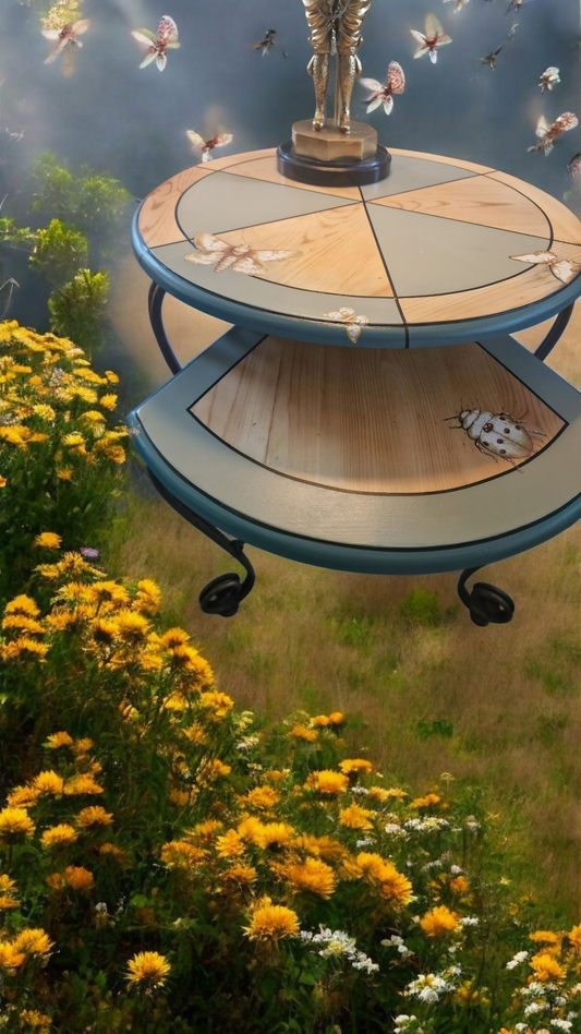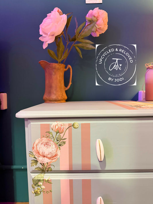 Pair of duck egg blue bedside tables. Upcycled night stands x 2 in French eggshell with pink floral and striped pattern (sold as a pair)