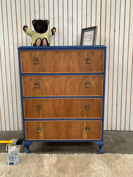 Upcycled 4 Drawer chest in a shabby chic blue ink colour on queen ann legs.