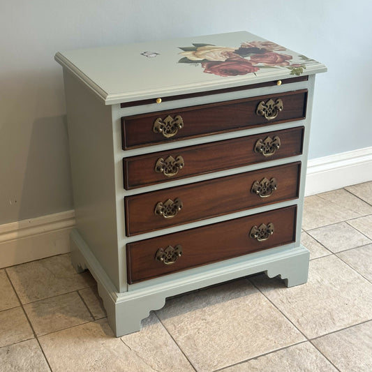 Beautiful vintage mahogany drawers/bedside table hand-painted duck egg with floral design