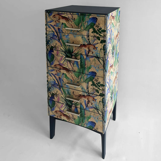 Vintage Tall Boy Chest of Drawers with Exotic Leopard Pattern