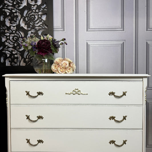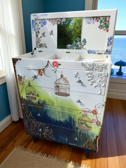 Very RARE Harris Lebus Huge Tallboy Chest of Drawers named Enchanted Birdcage with clever open lid mirror and jewellery/makeup compartment!