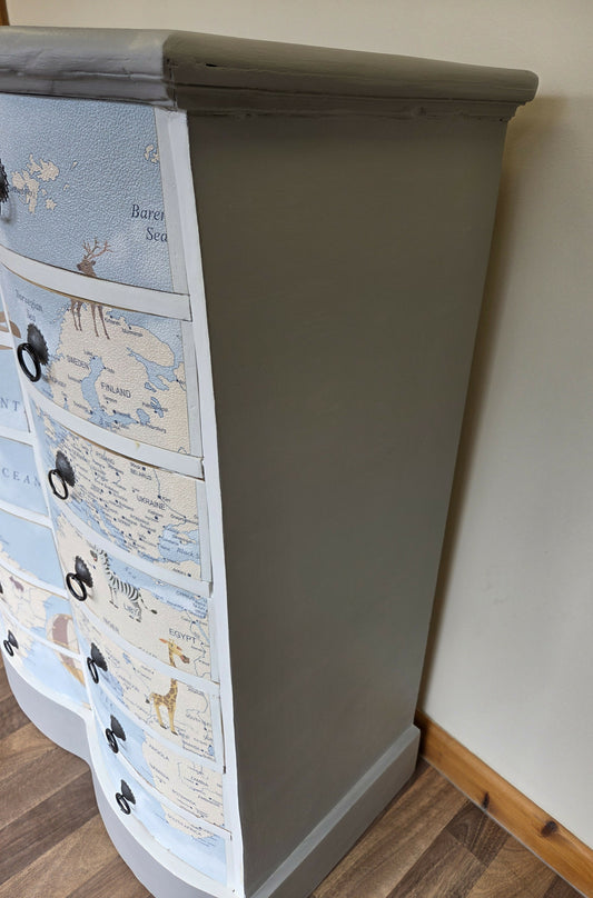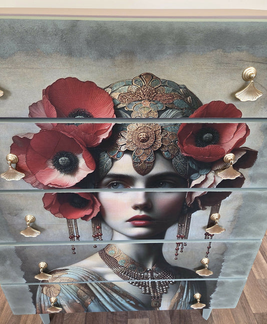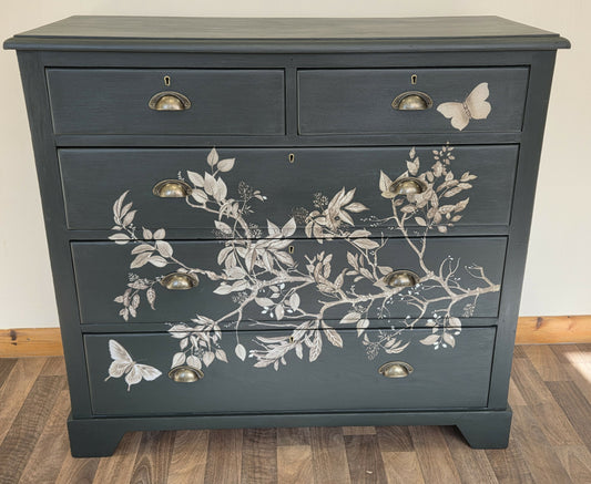 Upcycled Chest of Drawers – Floral Front, Dark Stained Top, Scandinavian Pink Chalk Paint Sides, oak Furniture