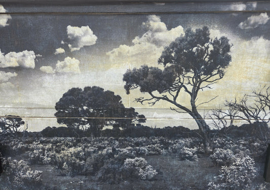 Vintage black/white/sepia mid-century moody decoupaged two drawer chest of drawers.