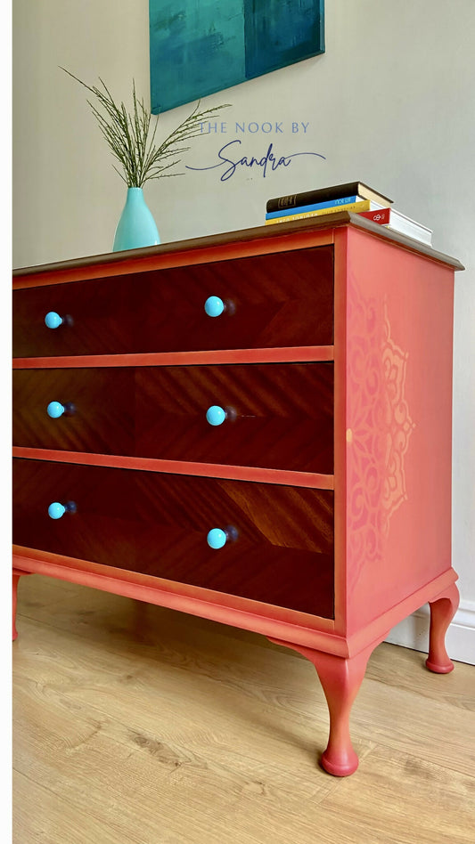 Upcycled Mid Century Chest of Drawers – Vintage Dresser with Coral Frame & Turquoise Knobs