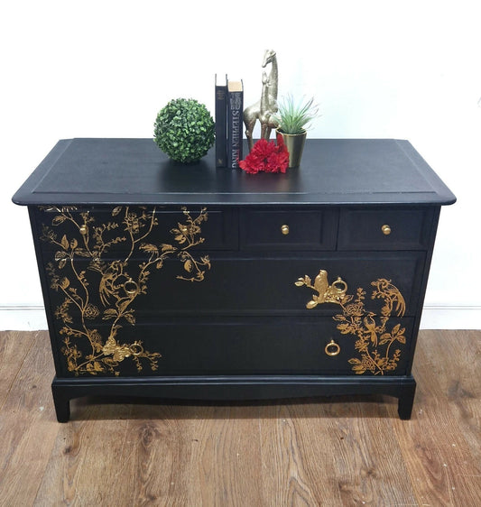 stag mistrel chest of drawers , black, gold bedroom furniture, stag furniture, modern